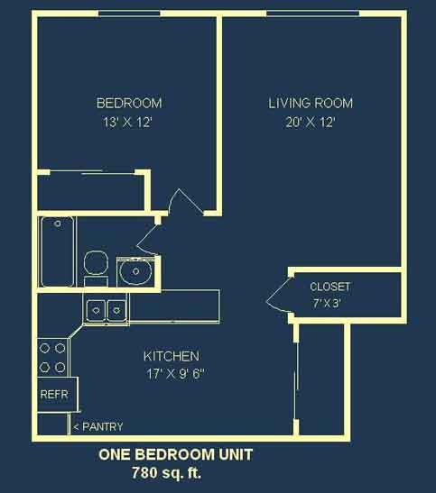 Dimensions: Kitchen (eat-in) - 17' x 9' 6" Kitchen features - refrigerator, gas range, dishwasher and 7' x 3' pantry. Living Room - 20' x 12' Bathroom - N/A Bedroom -13' x 12' Total Apartment - 780 Square Feet Tenant pays gas and electric utilities.